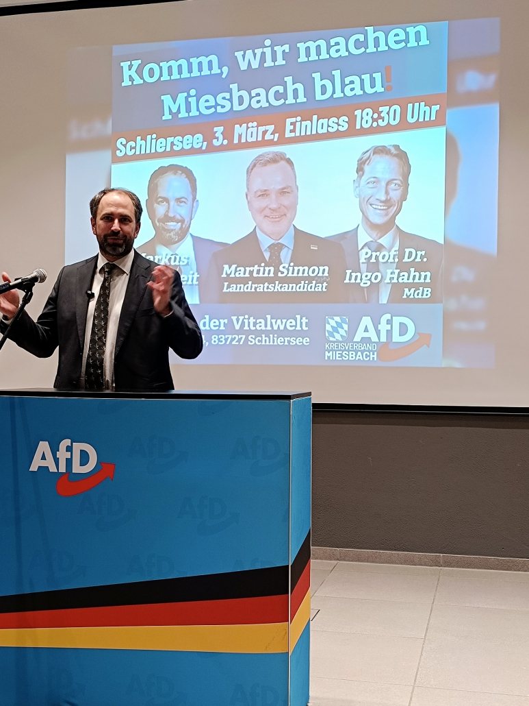Nur fünf Tage vor der bayerischen Kommunalwahl am 8. März 2026 hat der AfD-Kreisverband Miesbach in der Vitalwelt Schliersee eine programmatisch scharfe Großveranstaltung abgehalten. Unter dem Motto „Komm, wir machen Miesbach blau!“ stand vor allem die Rede des Landratskandidaten Martin Simon im Mittelpunkt, der klare Prioritäten für den Landkreis setzte und als ersten AfD-Antrag im Kreistag die Einführung einer Arbeitspflicht für Asylbewerber ankündigte. Die Veranstaltung zog zahlreiche Bürger an, die im Anschluss lange blieben, Fragen stellten und etliche neue Mitgliedsanträge ausfüllten.